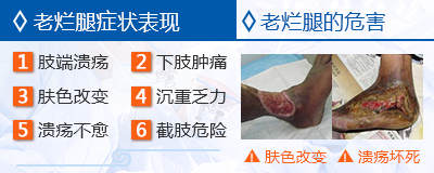 3、溃疡:再进一步发展,在患肢小腿内侧,外侧,踝部出现溃疡,皮肤僵硬且容易破皮溃烂,而且创口溃烂久治不愈,严重者不得不接受截肢而致残。
